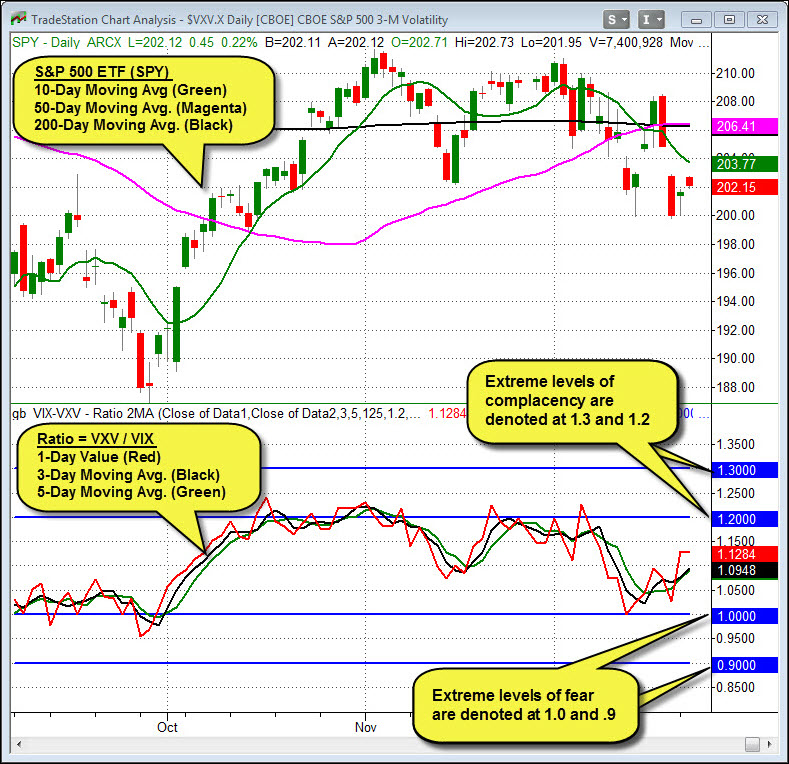 This chart tracks the 1-day (red) value, 10-day (black) average of this ratio.