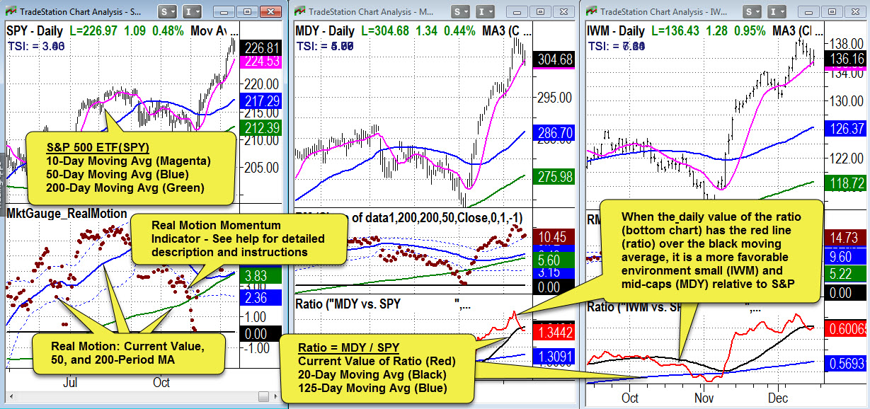 During business downturns small caps will often under-perform compared to mid or large caps as they have less resources to weather an ebb in the business cycle. Conversely during a strong economic climate, smaller cap companies can grow more quickly thereby enhancing returns.During a Risk-On environment, IWM (small caps) and MDY (Mid-caps) are compared to the S&P 500 (large caps) on this page and will pinpoint which Index offer the best opportunity. This workspace uses a price chart with moving averages along with ratio and real motion (momentum) indicators to identify turning points and to confirm which of the these three market cap indexes are currently outperforming and most likely to persist.