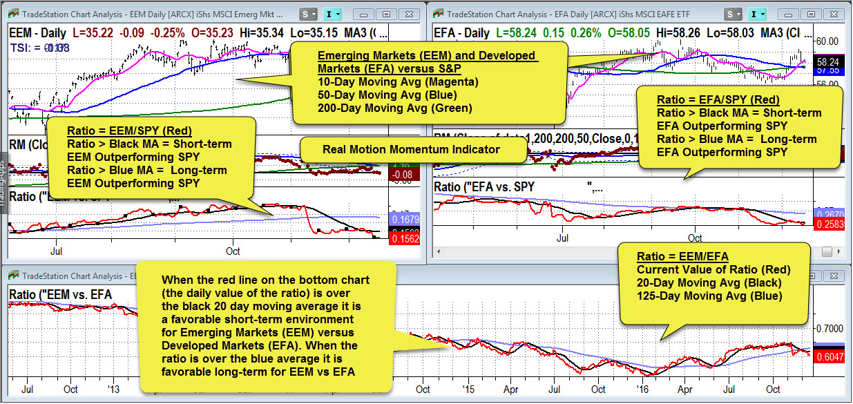 The two upper charts use the spread ratio (benchmarked against the SPY) as well as the Real Motion indicators for each of the instruments. The lower chart is a spread ratio between EEM and EFA. When the red line is increasing in value, emerging markets (EEM) are outperforming developed markets (EFA).