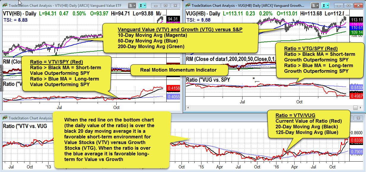 The two upper charts use both our real motion indicator and ratio charts (using the SPY as the benchmark) to determine the overall condition of both the Value and Growth Indexes.