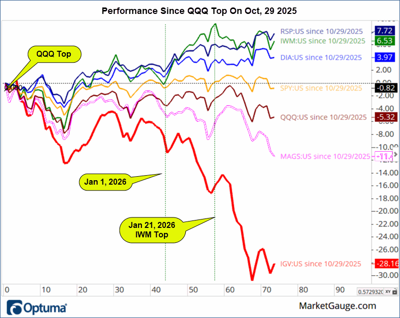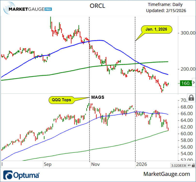 The AI destruction of market cap began in late 2025 with fears that capital spending would bring down the biggest spenders. Without waiting for proof, investors hammered the Mag 7 stocks (MAGS) on these new fears. ORCL was the canary in the coal mine when it broke below its 50-day moving average in the same week that the QQQ topped with the big cap tech MAG 7 (MAGS), leading the way down. See the chart below.