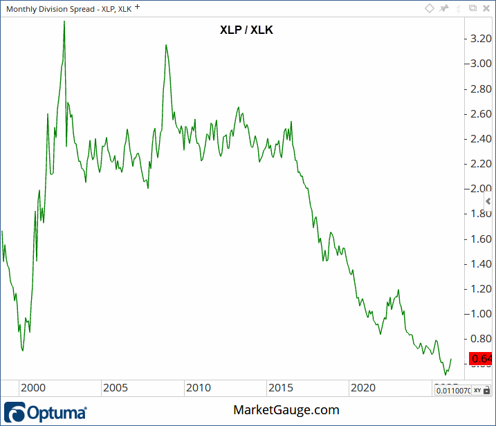 The rush to the physical goods we need, ‘staples’, is typically a sign of recession fears and a defensive investment posture. It’s also been a trade with a limited time frame, because tech and growth have been the secular themes for decades.