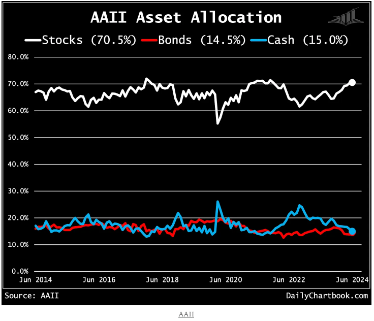 AAII asset allocation (I). Retail investor stock/cash allocations are at their highest/lowest since November 2021.