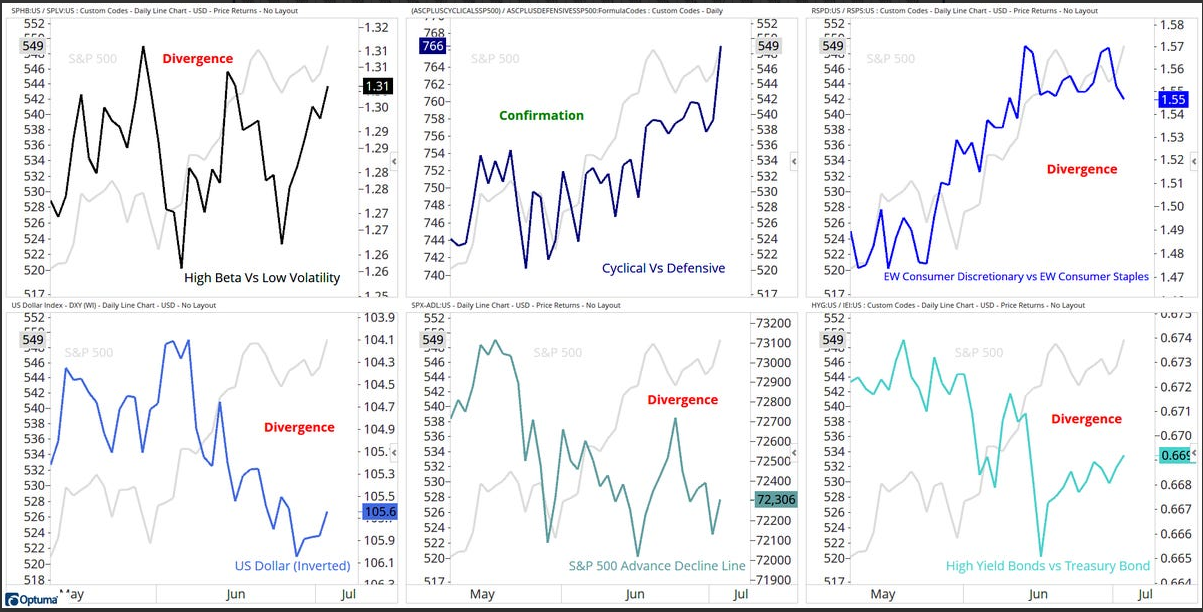 - Confused read with Color Charts (a moving average of the number of stocks above key moving averages) giving a mixed signal for the S&P 500. (=)