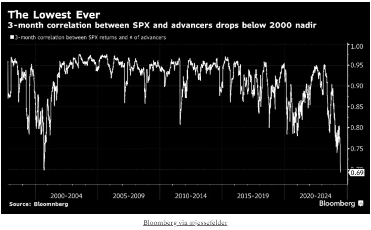 Performance vs. breadth. “The 3-month rolling correlation between SPX returns and the number of advancers is at an all-time low. The only period remotely resembling what we’re seeing now came in 3Q of 2000.”