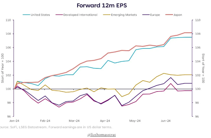 Global earnings trends. “Forward earnings expectations are up 8% in the U.S. and Japan, while other regions have seen more muted upward revisions (improved trajectory since mid-April though).”