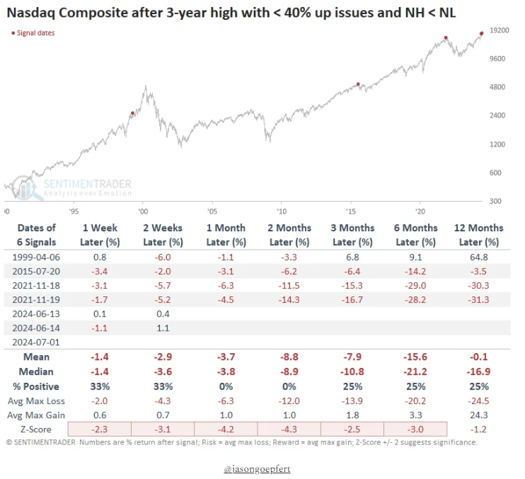 Nasdaq highs vs. lows. “This is not a healthy market. The Nasdaq Composite scored another new high on Monday. But fewer than 40% of stocks advanced, and there were more new lows than new highs. It joins only a few other sickly markets as precedents.”