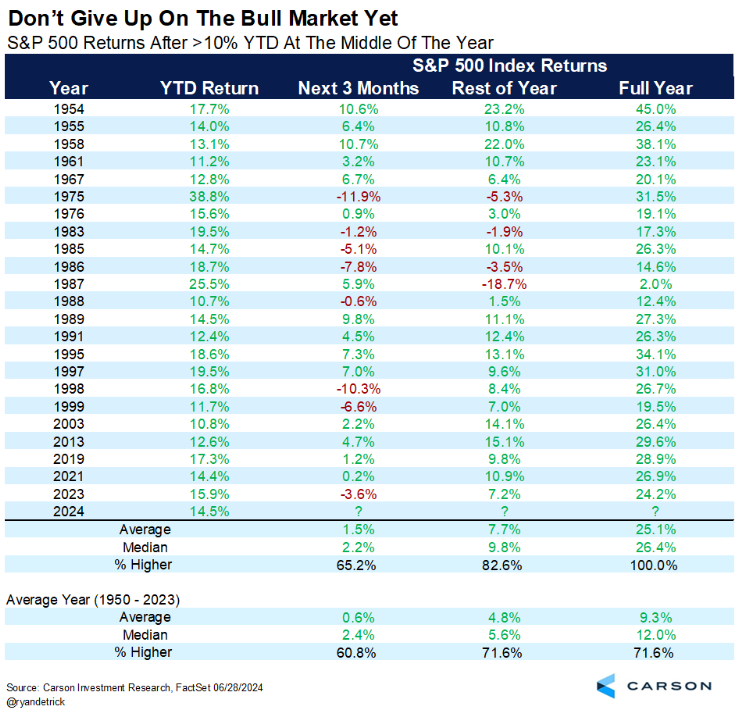 Turning to returns, the median rest-of-the-year return had a very impressive 9.6%. This is well above the median return for all years of 5.6%. This means that we could very likely see more new all-time highs during the remainder of 2024 and a continued profitable period for all those retail folks participating in the markets (as evidenced above). See the chart below of what historically has occurred when we have this many new all-time highs so far in the middle of the year: