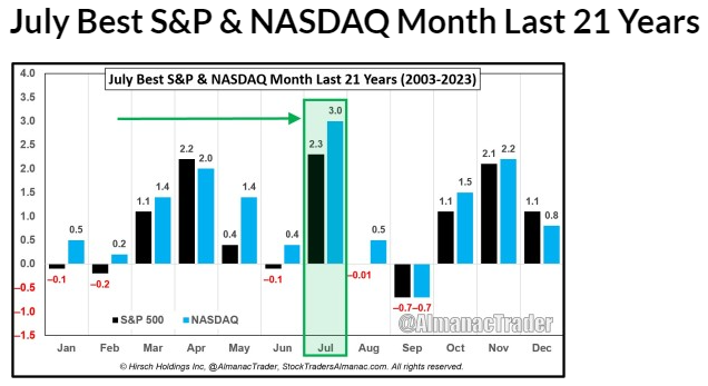 To reinforce the July narrative, we have taken information provided by our friends at Stock Trader’s Almanac (Jeffrey Hirsch) who have provided additional information below regarding the returns for July from the past 21 years. See below: