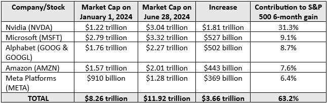The S&P 500 produced a 14.5% return for the first 6 months of 2024, so these 5 companies produced 63.2% of that return. In other words, those 5 companies helped contribute 9.16% of the 14.5% return of the S&P 500.