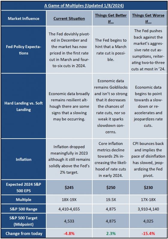 If inflation picks up and/or the Fed materially pushes back on the idea of rate cuts in March (and for much of 2024), economic growth begins to accelerate and inflation (CPI/Core or PCE Price Index) ticks up, this scenario would negate much of what the Q4 2023 rally was all about.