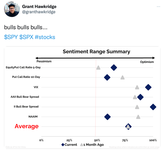 Most of the sentiment readings we follow are continuing to show “green lights” and reflect on the optimistic, bullish stock market environment, for the moment. See chart below: