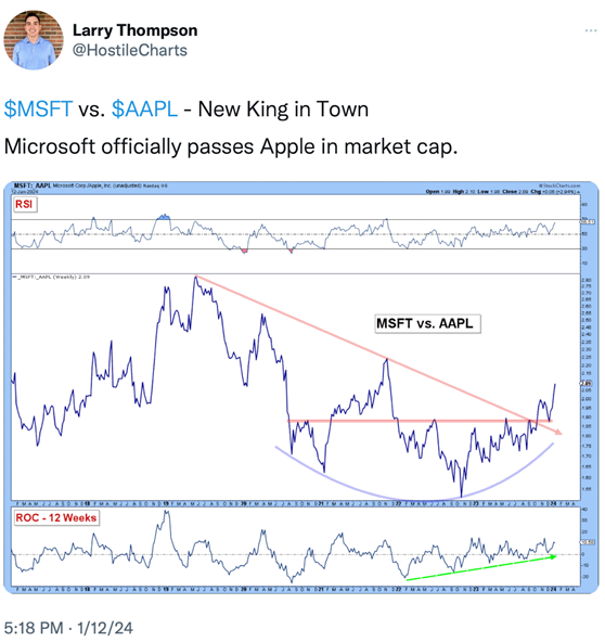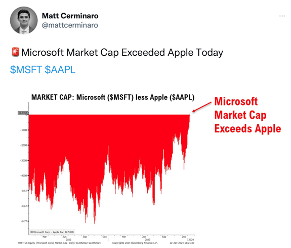 As you can tell from the upper left corner, the new king is Microsoft. Its market cap now exceeds Apple’s. See the two charts below: