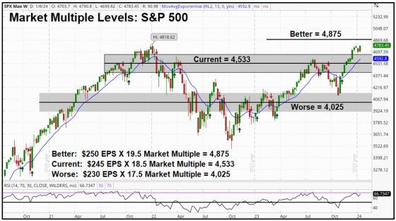 S&P 500 earnings are expected to hold steady at $245 a share. With a multiple range of 17.5x to as high as 20x, we could see a range of 4,300 on the S&P to 4900.