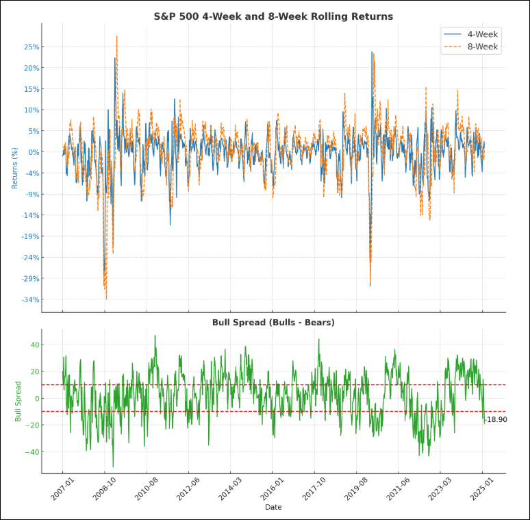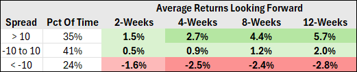 Note: Data not shown here indicates that when the spread falls below -20 and -30, the returns get progressively more negative, and when the spread is over 20 or 30, the returns get progressively more bullish.