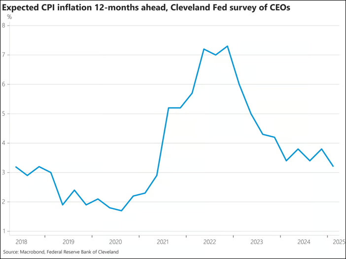 Now consider this data below from the Cleveland Fed. CEOs in this survey expect 3.2% inflation 12 months ahead. That’s the lowest since 2018.