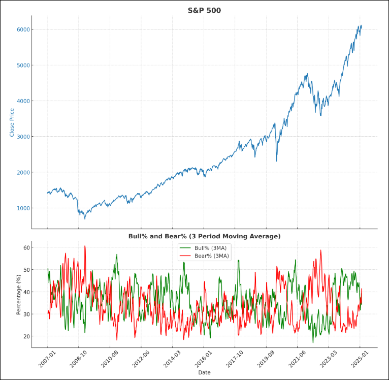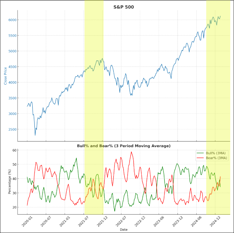 In the chart below, you can see that the percentage of respondents who are bearish (red line) has been increasing since late 2024 as highlighted in yellow. You’ll also notice a similar pattern of increasing bearish respondents occurred when the market was in a prolonged bull trend at the end of 2021.