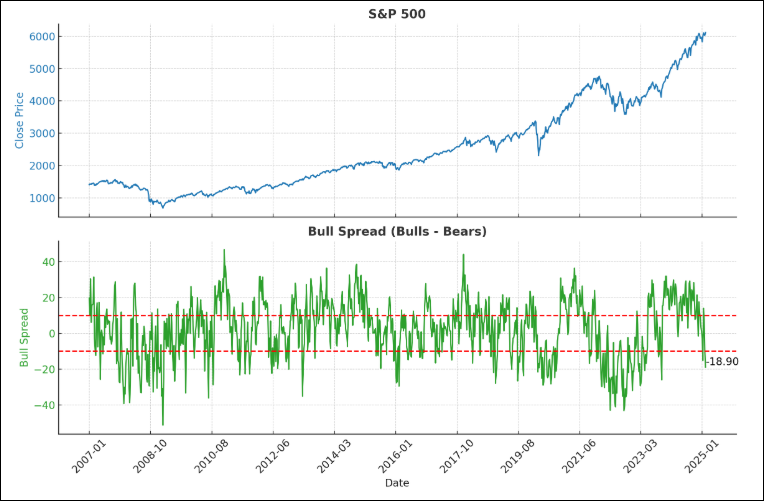 Below is a chart that shows the “spread” of bulls vs. bears. It is simply the % of bulls minus the % of bears.