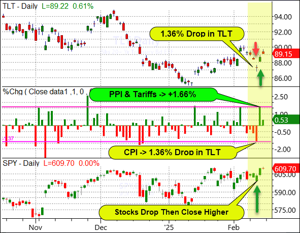 More specifically, the CPI report on Wednesday was hotter than expected and led to the biggest daily drop in the TLT in 2025. However, stocks shrugged off their lower open and closed higher.