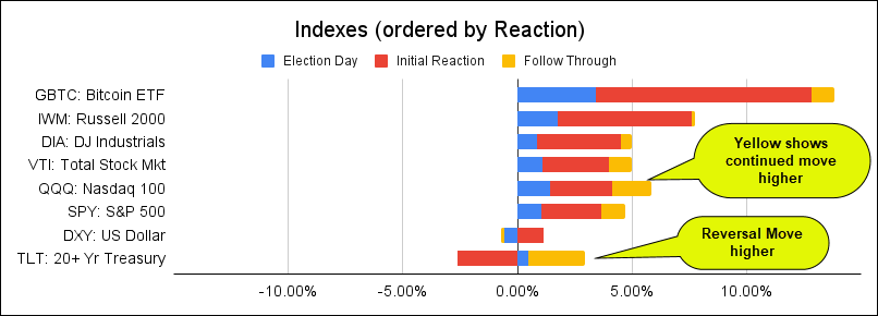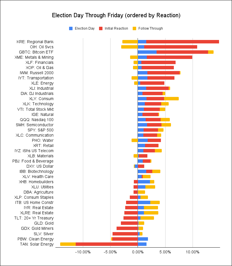 - On election day (blue), before the winner was determined, the trend in almost every category was bullish.