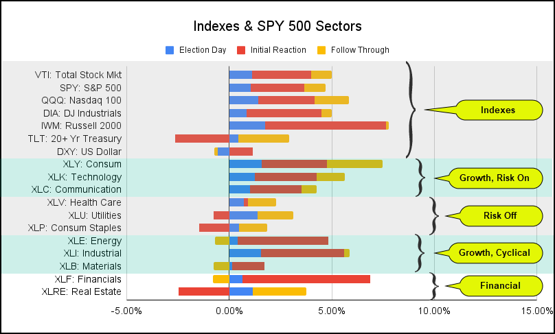 - Grow focused sectors were the clear winners. Risk-On sectors continued to rally after the initial reaction. This is the most bullish pattern.
