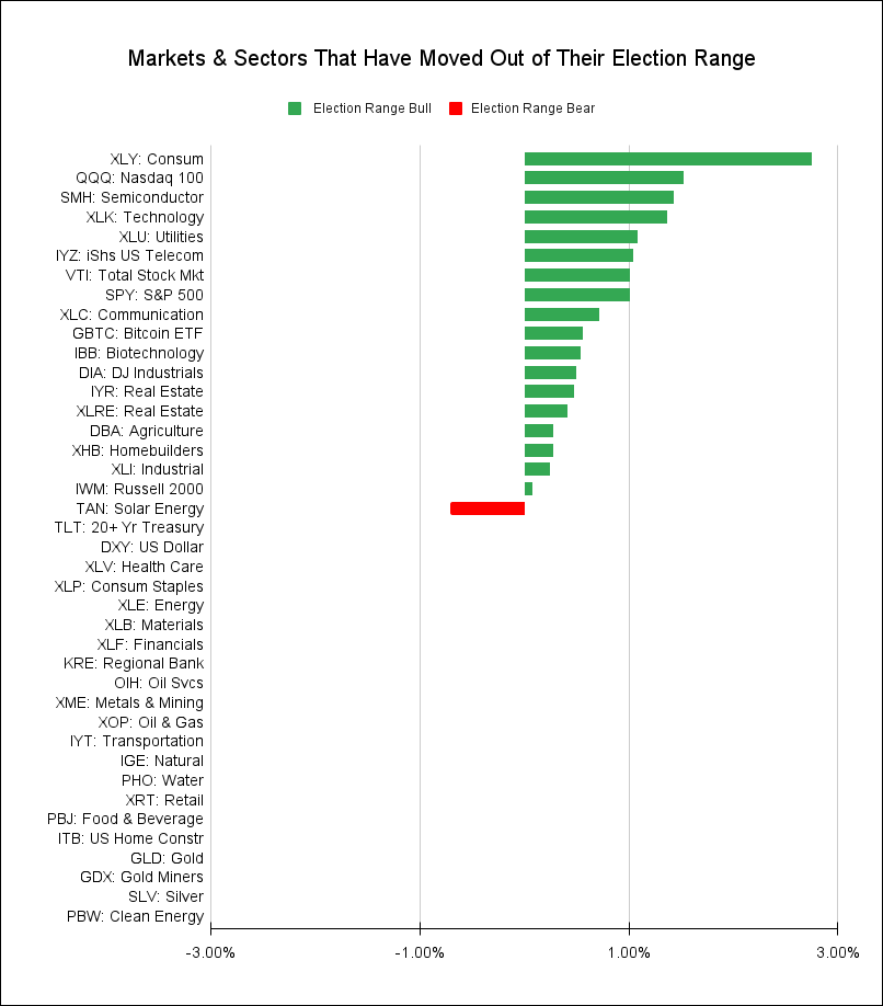 Below is a chart of the markets and sectors covered in this article with charts illustrating the magnitude of any election range breakouts.