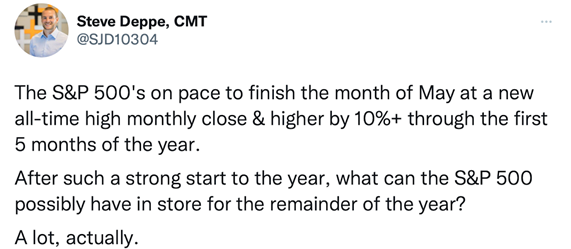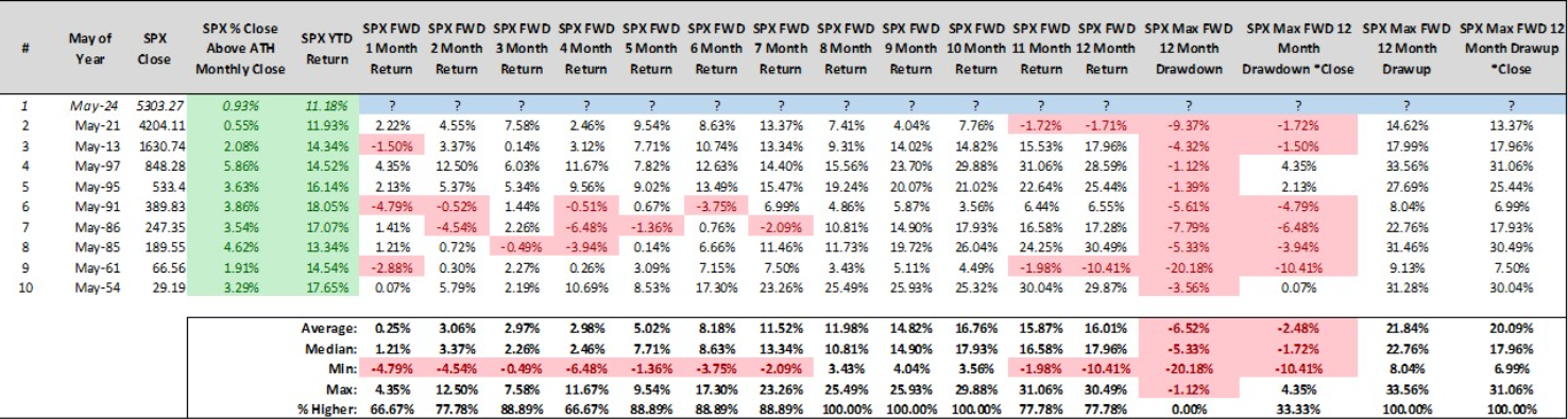 If the S&P 500 finishes in May on the positive path it is currently on, what might occur? Below we provide some interesting numbers of previous periods when May was positive after a good start to the year.
