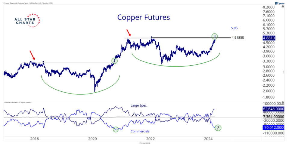 And here is a look at copper, which has surprised many investors during 2024, but shown up in several stocks closing at new all-time highs (SCCO up 45.6% ytd, FCX up 27.4% ytd and the ETF COPX, up 37.8% ytd). The first graph shows a shorter time period and the second chart shows a longer history of Copper from 2018. See below: