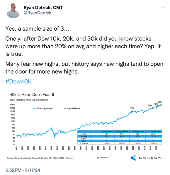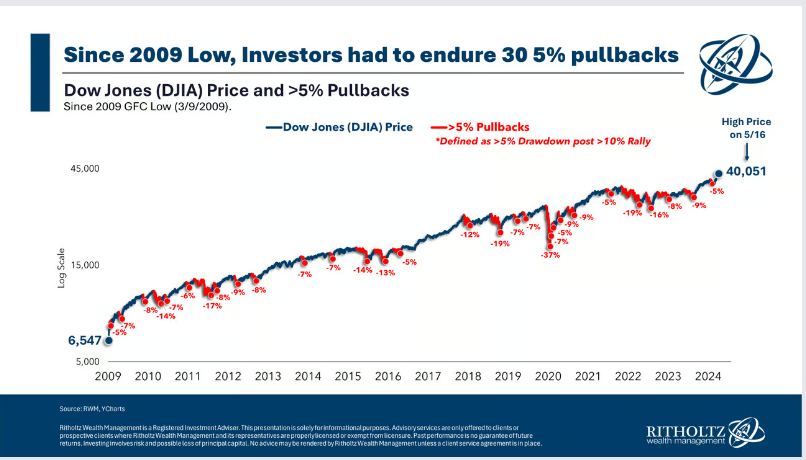 It also might surprise you to know that even though the Dow just hit 40,000, a new all-time high, it has experienced 30 5% corrections since the great financial crisis of 2009. See chart below: