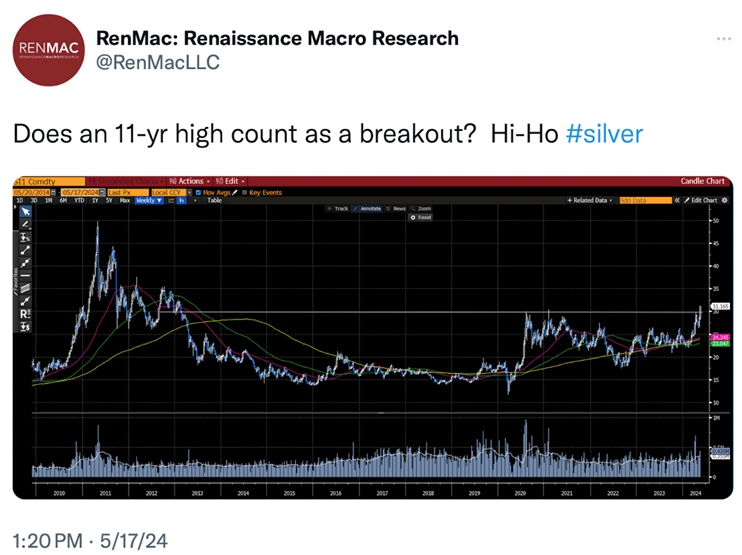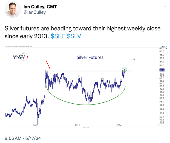 Since the mid-point during 2023, both Mish and I have been discussing the possibilities for the commodity super cycle and the various ways to take advantage of this cycle. (Mish much more than me). This included such ETFs last year as DBA (Agriculture), CANE (Sugar), Oil (USO) and then about 6 months ago or so, Gold (GLD), Silver (SLV) and gold miners (GDX). Last week I also mentioned Silver Miners (SILJ).