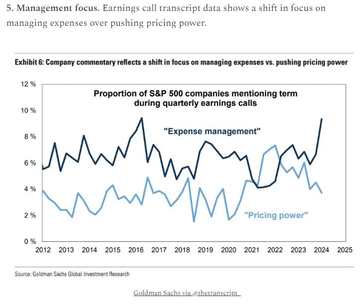 The positive economic mantra is that inflation is trending down and some of the accompanying recent economic indicators show a softening economy. This has been echoed numerous times during recent earnings announcements by corporate CEOs and CFOs as they communicate a “cautious” next year forecast. The corporate management folks are now concerned about reigning in costs more than they feel they can increase prices. See chart below: