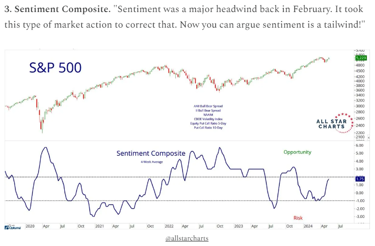 Another bright spot in the readings right now is that investor sentiment has gone from headwinds just a short few months ago to now a tailwind. According to All Star Charts below, this should help the markets sustain their recent gains. See chart below: