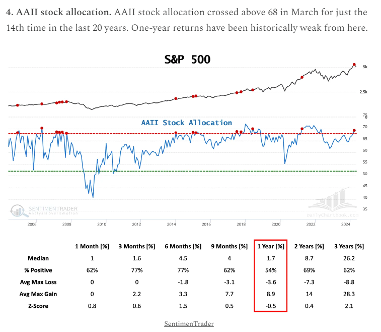 Since late March, the American Association of Individual Investors has shown a higher allocation to stocks which is one of their contrarian indicators. Typically, when these readings get this high one year later the markets have had mediocre returns. See chart below: