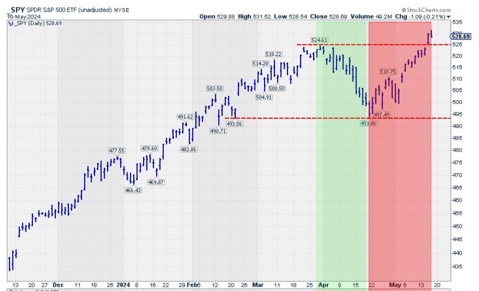 Now we know! With the recent breakout of the SPY, QQQ and Dow all reaching new highs (Dow 40,000), I believe we got our answer. See the following chart of the recent breakout in the S&P 500: