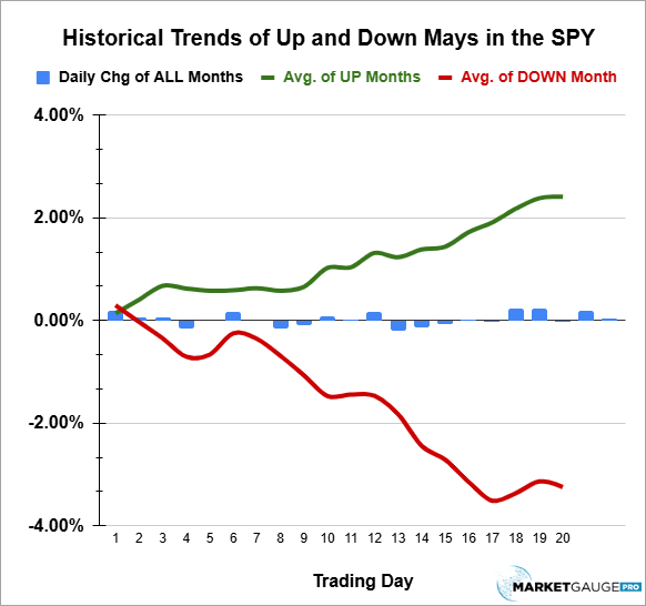 The idea of not fighting an uptrend in May is further supported by the chart below, which shows the seasonal pattern of the months of May that closed higher and those that closed lower.