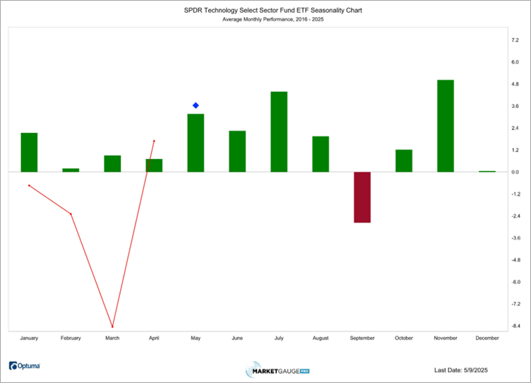 If you look at the seasonality by sectors in the Seasonality area of our Big View service you’ll find the chart of the tech sector  ETF (XLK) which shows it has been very strong in May. In fact, seasonally, it is one of the strongest sectors.