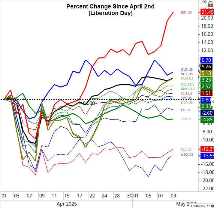 As you can see from the chart below which displays several assets, indexes and ETFs since Liberation Day, Bitcoin (IBIT) has dramatically outperformed all other assets by a factor of 4x of greater!