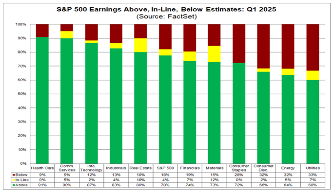 • Earnings Scorecard: For Q1 2025 78% of S&P 500 companies have reported a positive EPS surprise and 62% of S&P 500 companies have reported a positive revenue surprise. Both the percentage of S&P 500 companies reporting positive earnings surprises and the magnitude of earnings surprises are above their 10-year averages.