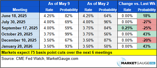 The net result of last week’s news on the market’s expectations for fed funds rates was negligible. The table below shows that the market expects 75 basis points in cuts over the next six meetings, which is the same as the prior week.