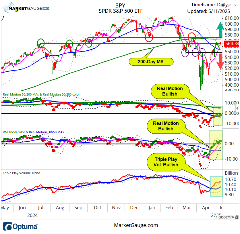 The indicators below the price chart, Real Motion and Triple Play Volume Trend, are bullish, and they become much more so if the 200-day is taken out on the upside.