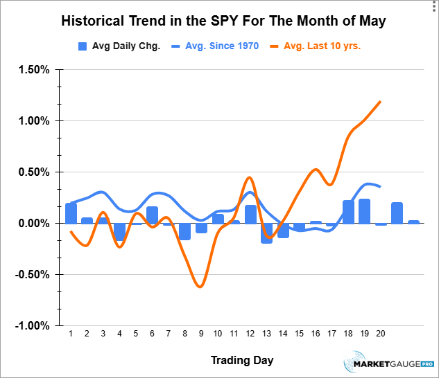 As you can see below, the seasonal pattern of May over the last 10 years (orange line) has been one that rallies in the second half of the month. This would suggest that if the market breaks higher next week, don’t fight it.