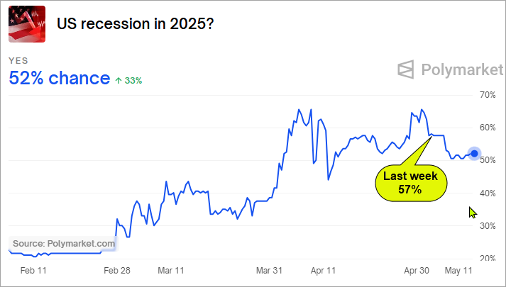 Following up with market-based bets on the likelihood of recession in 2025 that we shared last week, you can see from the chart below, Polymarket’s odds of recession also dropped last week by 10% (from 57% to 52%).