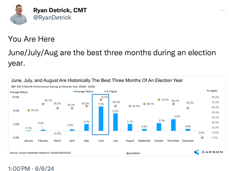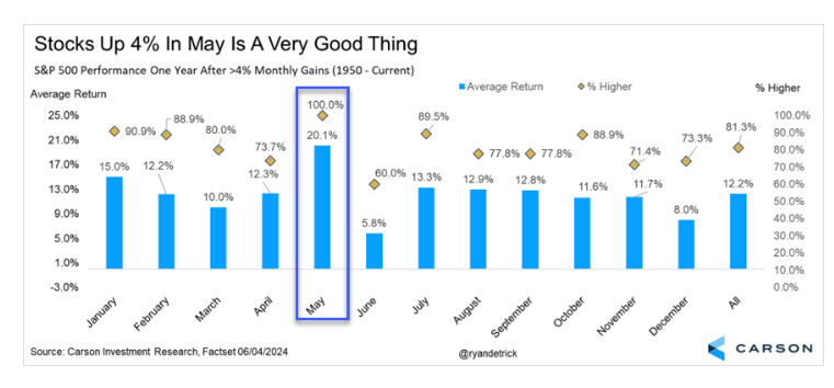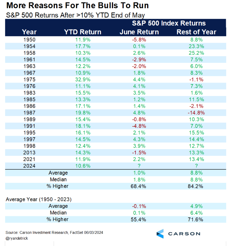 After a 4% May and better than a 10% return year-to-date through May, all indications are for a positive market for the remainder of the year, according to the research from Ryan Detrick at The Carson Group.  See below: