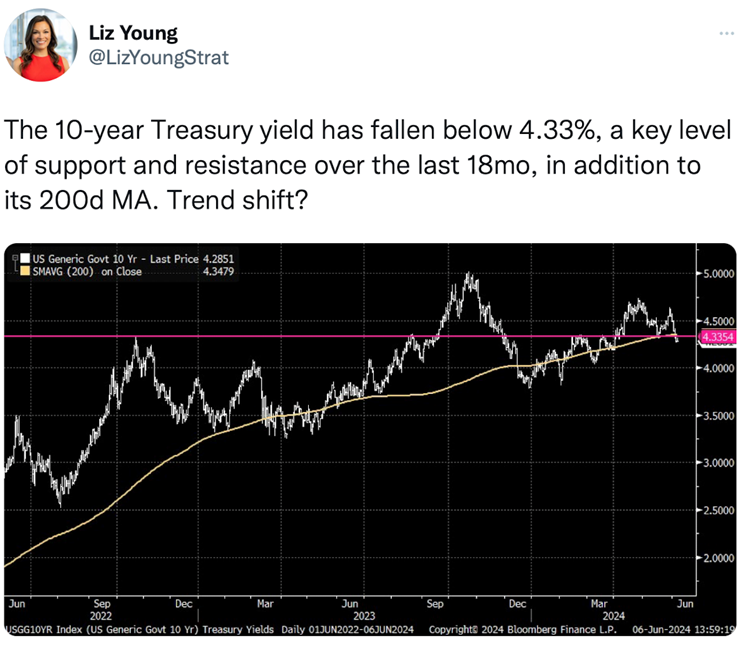As I often peruse many research services towards the end of the week, I was pleasantly surprised Thursday evening with a few charts and commentary about recently perceived economic softness and the fact that bonds had rallied, giving an indication that we may see the Fed cut rates soon.  Something most investors have been anxiously waiting for.  Here is one of those Thursday night charts: