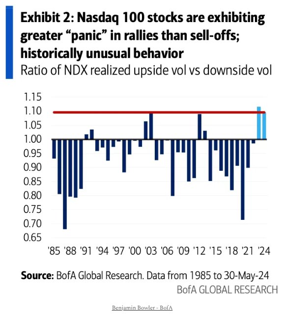 FOMO. “The fear of missing out on upside gains (FOMO) exceeding the fear of downside may seem irrational. But it’s happening. Since 2023 US equities have exhibited higher volatility on days equities are up than on days they are down