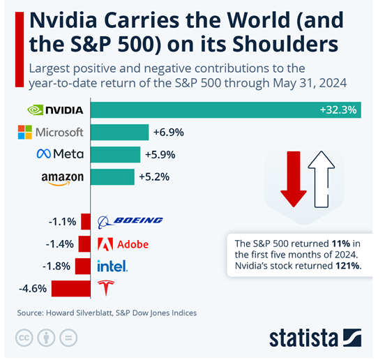 Is that Nvidia is holding up the market.  It is doing the most heavy lifting of any of the mega cap stocks.  A simple analysis would show you its significant contribution through Friday. The S&P 500 is currently up approximately 12% year-to-date.  Without Nvdia’s now $3 trillion valuation and significant influence on the cap weighted S&P 500 index, the S&P 500 would only be up about 8%.  A good illustration of how much “heavy lifting” this stock is doing is also contained below: