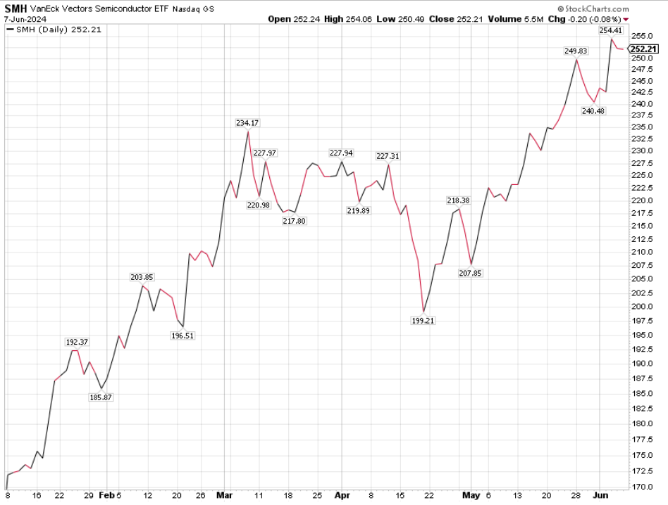 Of course, there have been semiconductor winners and losers in this cycle.  Nvidia is the big winner, along with other stocks recently hitting new highs such as Micron (MU) ARM Holdings (ARM), Broadcom (AVGO), Taiwan Semiconductor (TSM), Super Micro Computer (SMCI) and other Chip companies, most of whom are involved with the development of Artificial Intelligence in computing (AI).  Some of the older chip companies not as directly impacting AI like Intel and AMD have been lagging.   Please find a chart of the SMH (Semiconductor ETF) for 2024 so far below: