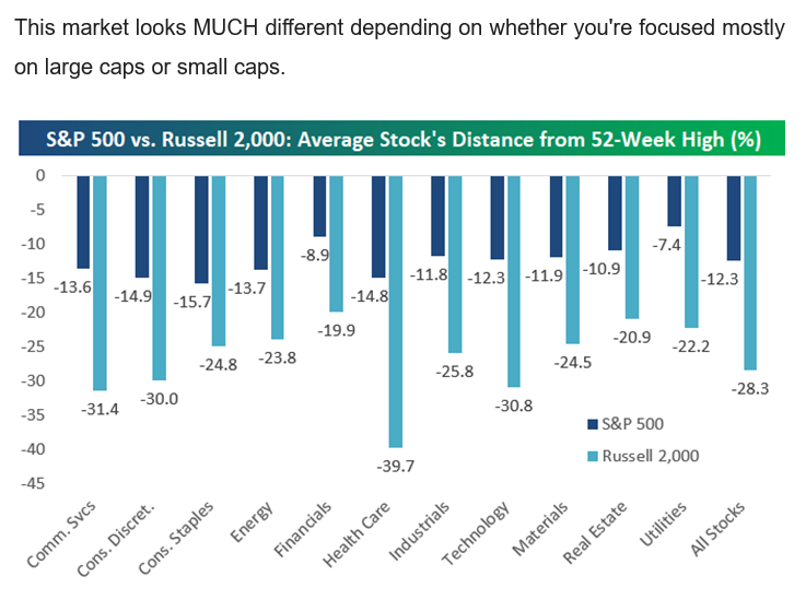 The market looks much different if you compare large cap stocks to small-caps (Russell 2000 index).  You can see the stark contrast between the health of each of these two markets in the chart below: