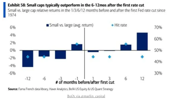 Stocks vs. first cut. “Historically, Small Caps tend to outperform in the 6-12 months after the 1st rate cut (83% prob in Sep).”