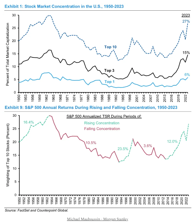 Right now, the markets are also overly concentrated, given that the mega cap stocks (Google, Microsoft, Meta, Apple, Nvidia) are weighted by valuation, heavily in the index (now over 50%).  “The market tends to produce returns above the historical average in periods when concentration is rising and returns below the average when concentration is falling.”  See chart demonstrating this below: